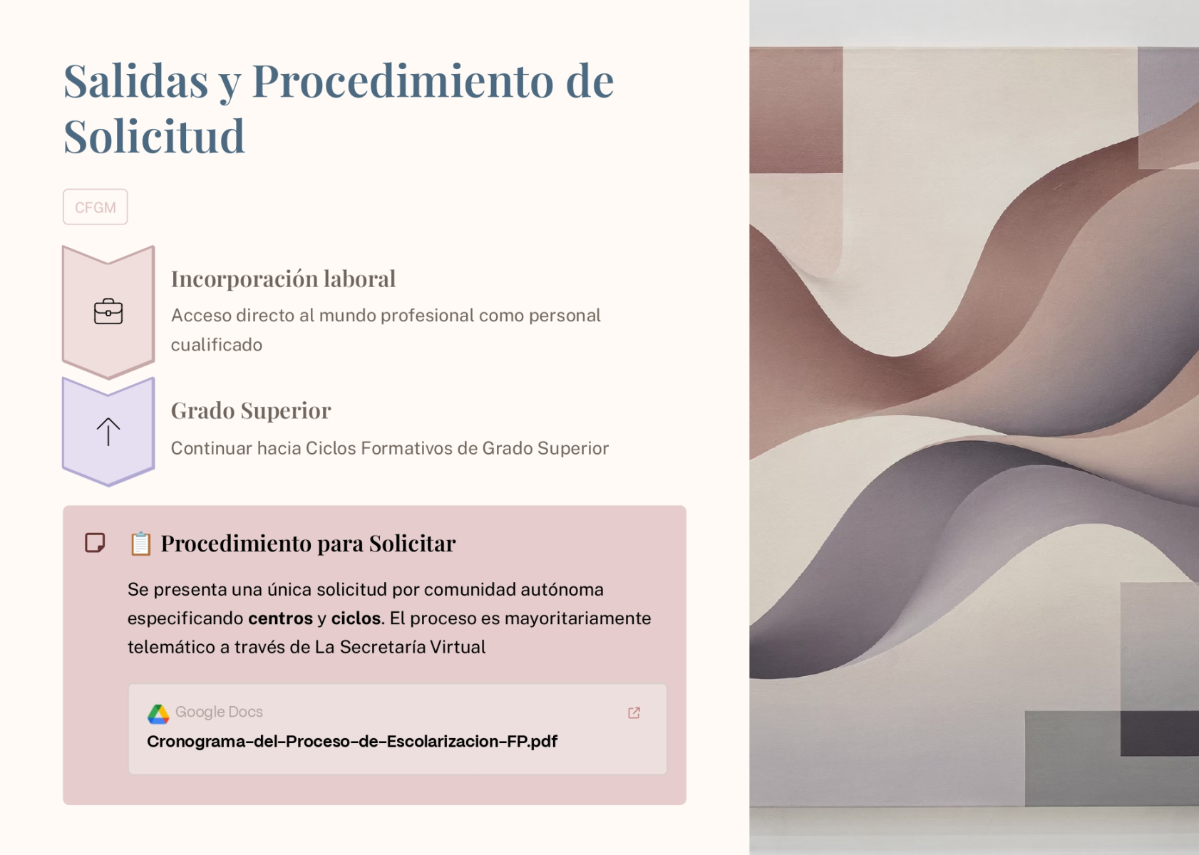 En primer lugar queremos ofrecer una información clara y concisa sobre las distintas posibles opciones académicas que se ofertan una vez finalizados los estudios de Secundaria (4º ESO). El Dpto de Orientación del centro ha realizado la siguiente presentación que sirve para orientar, aconsejar e informar a nuestro alumnado y sus familias.